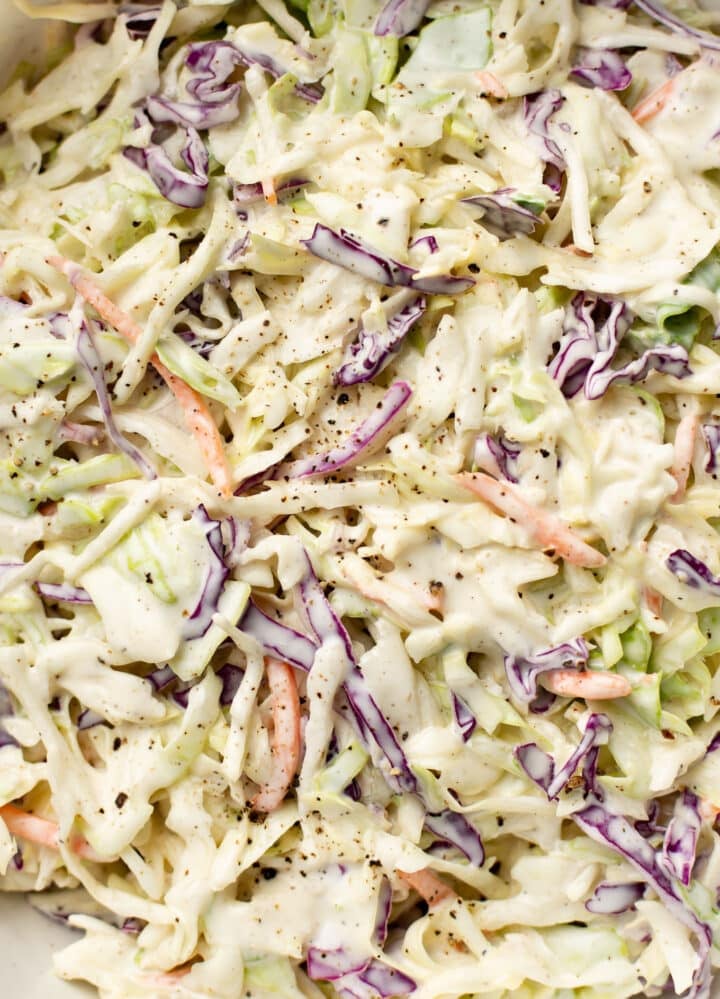 Since there’s nothing more disappointing than sad coleslaw (ok, maybe I’m exaggerating a little) at a BBQ or cookout, I decided to make THE best coleslaw. Mine is balanced between being creamy, tangy, a touch sweet, and has an irresistible savory zip!