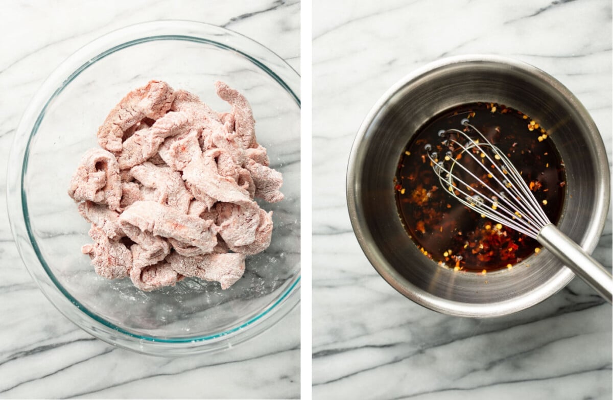 Prep the ingredients. Slice the steak into thin ribbons, and toss with the cornstarch in a bowl. In a different bowl, whisk together the sauce ingredients until combined.