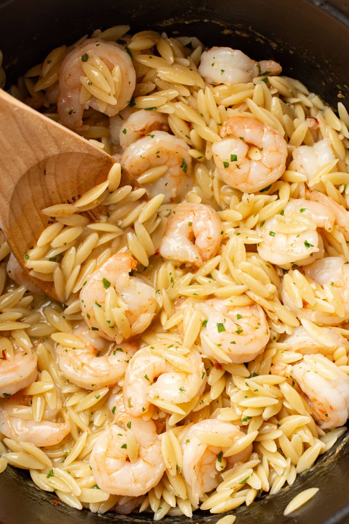 This easy shrimp scampi orzo recipe is a one pot meal that combines hearty pasta with the traditional flavors of shrimp scampi! It has a bright and buttery yet light white wine sauce.