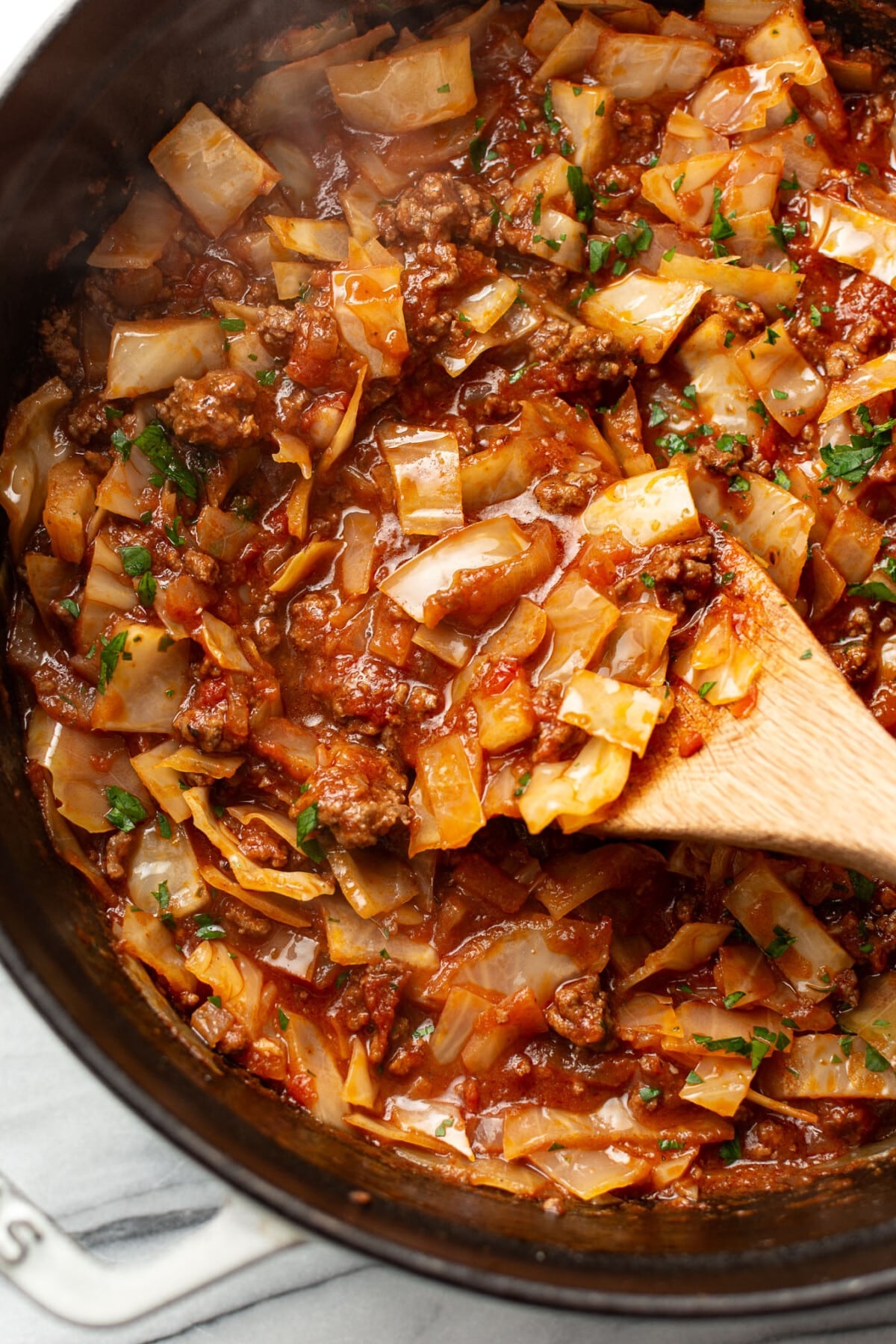 - Add in the crushed tomatoes, tomato sauce, beef broth, and cabbage. Give it a good stir. Once it starts bubbling, reduce the heat to a simmer (medium to medium-low) and cook for 30 minutes, covered, stirring occasionally, or until the cabbage has reached your desired tenderness. Consistency of canned tomatoes can vary (some are thicker than others), so keep an eye on it and add some extra beef broth if it looks a bit dry. The cabbage will release some water as it cooks down.